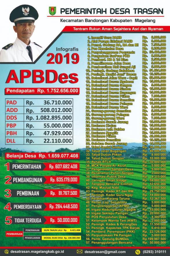 Dalam  rangka  transparasi dan akuntabilitas maka pemerintah Desa Trasan akan mengadakan Baliho APBDes Tahun Anggaran  2019 untuk diketahui dan dicermati oleh  seluruh warga  masyarakat.