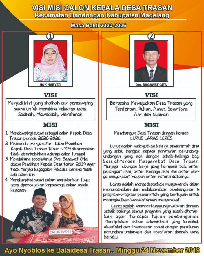 Seperti Pilkades tahun sebelumnya, Pilkades Trasan tahun 2019 kali ini diikuti dua calon yakni Nok Haryati dan Drs. Bagawat Gita. Kedua calon akan berkompetisi dalam ajang pilkades serentak bersama desa yang lain di Kabupaten Magelang.