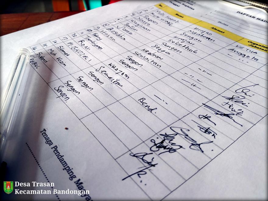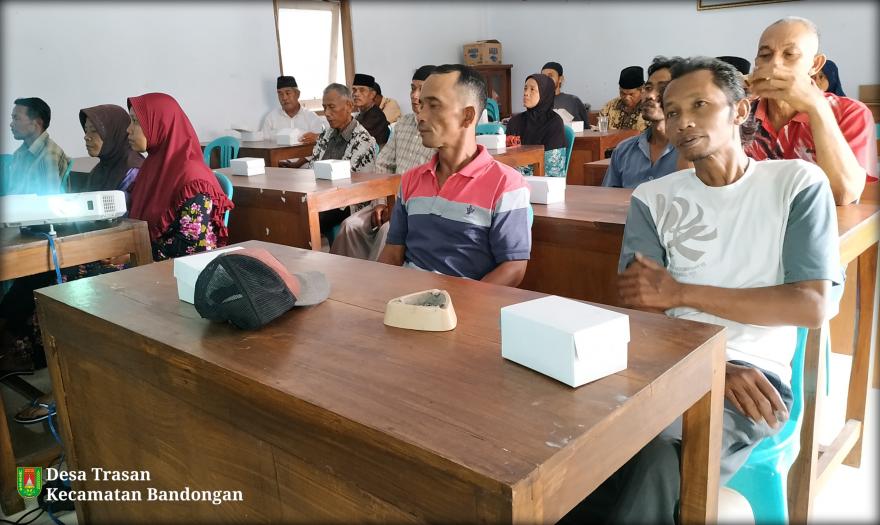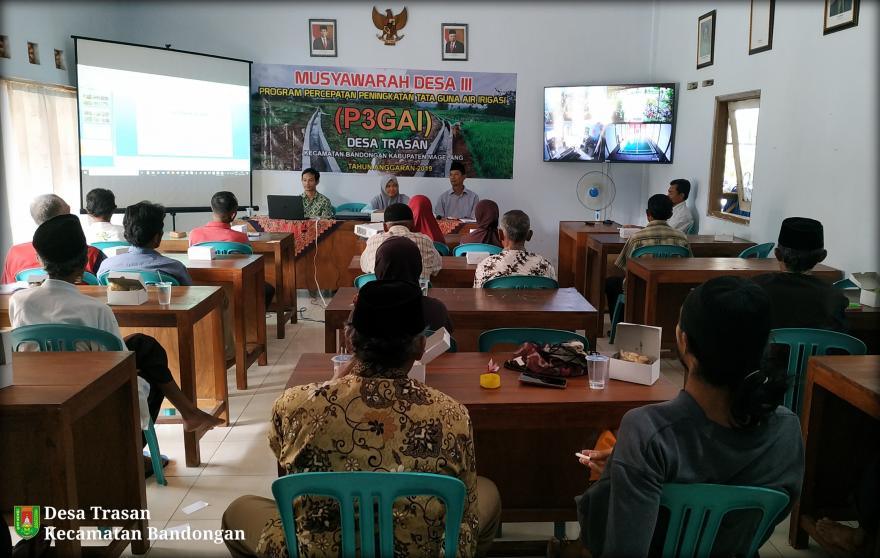 Serah terima Musyawarah tahap III Program Percepatan Peningkatan Tata Guna Air Irigasi Desa Trasan tahun anggaran 2019 sudah berakhir, Minggu (30/11/2019). Dalam realisasinya pembangunan irigasi terbagi 2 titik, titik pertama saluran Sebumen-Setanjung masuk wilayah Dusun Krajan dan titik kedua saluran Setro masuk di wilayah Dusun Sengon. Hasil dari laporan pertanggung jawaban yang disampaikan Kepala Desa Trasan Drs. Bagawat Gita, aliran Sebumen-Setanjung tercapai pembangunan lantai 161m siklup 283m, sedangkan aliran sengon pembangunan lantai 133m siklop 167m. Sisa anggaran dialokasikan pengairan ngabean 13m³. Dari anggaran Rp.195.000.000 baru turun Rp.131.000.000. Anggaran yang sudah digunakan 188.7070.700. Persiapan serah terima tingkat kabupaten Rp.1.000.000