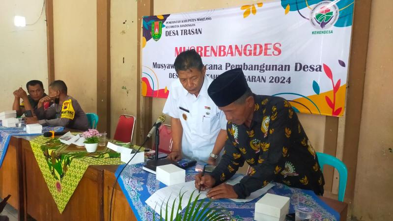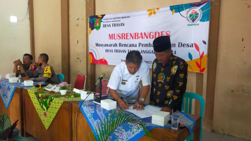 Pemerintah Desa Trasan melaksanakan Musyawarah Perencanaan Pembangunan Desa atau yang lebih dikenal dengan sebutan Musrenbangdes yang mana kegiatan ini dilaksanakan pada hari Rabu tanggal 09 Agustus 2023 bertempat di Gedung Sarwo Migunani Balai Desa Trasan. Kegiatan tersebut dihadiri dari Sekcam Bandongan H.Haryono, S.Pd, M.Pd, Kasi Kecamatan, Kepala Desa Trasan Drs. Bagawat Gita beserta perangkat, Ketua BPD Trasan beserta anggota, Babinkamtibmas, Babinsa, Toga, Tomas, Kader dan perwakilan karang taruna yang ada di wilayah Desa Trasan.
