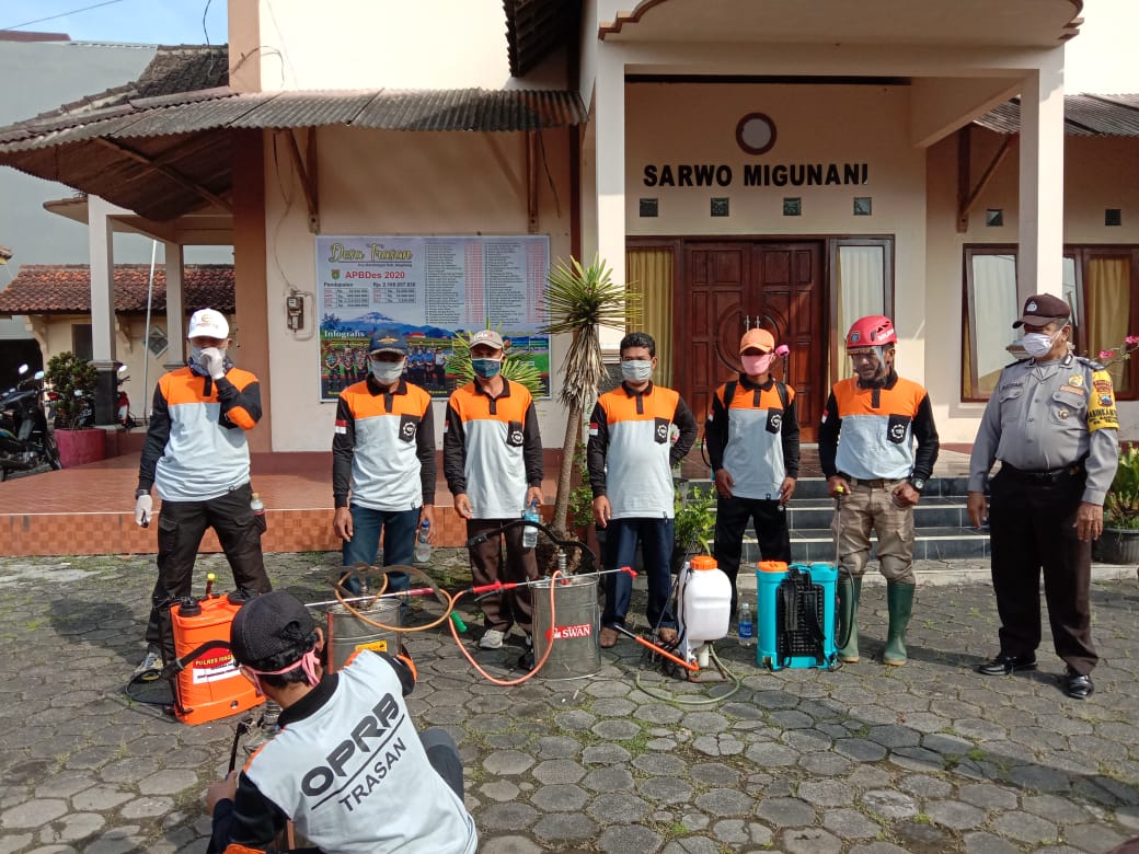 Pukul 08.30 Kepala Desa Trasan memberikan pengarahan kepada anggota OPRB bahwa dalam melaksanakan penyemprotan kita fokuskan ke tempat umum seperti halnya tempat ibadah, sekolahan, pondok pesantren dan yang biasa digunakan untuk berkerumun. Lebih dari 40 titik yang kita semprot dan diaharapkan semuanya bisa bekerja dengan baik.