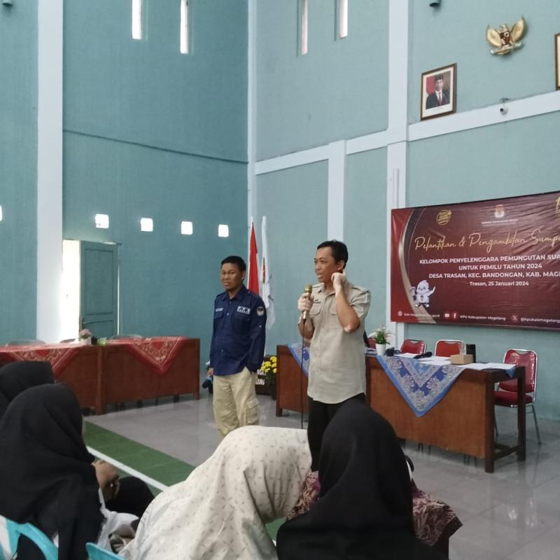 Panitia Pemungutan Suara (PPS) Desa Trasan atas nama Komisi Pemilihan Umum (KPU) Kabupaten Magelang melantik anggota Kelompok Penyelenggara Pemungutan Suara (KPPS) Desa Trasan, Kecamatan Bandongan, Kabupaten Magelang, pada hari Kamis (25/1/2024) di Gedung Sarwo Migunani Desa Trasan.